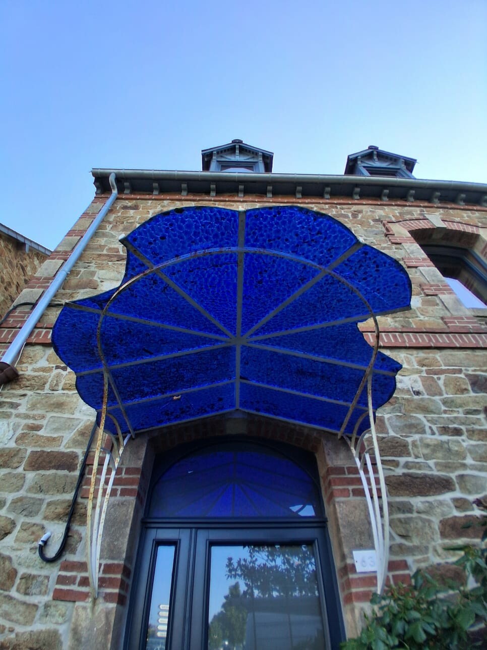 Remise en état de cette marquise à Lamballe, réalisation de gabarits pour la découpe des verres, peinture de la marquise par le client, et pose des nouveaux vitrages martelés en verre clair